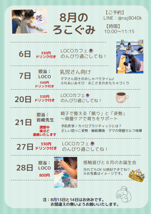 0歳からOK!未就園のお子様とママのサークル〖ろこぐみさん〗 8月もいろんな教室がありますよ(*^^*) ろこぐみの登録がない方も、見学はいつでもOKです♪ ※登録無料です!