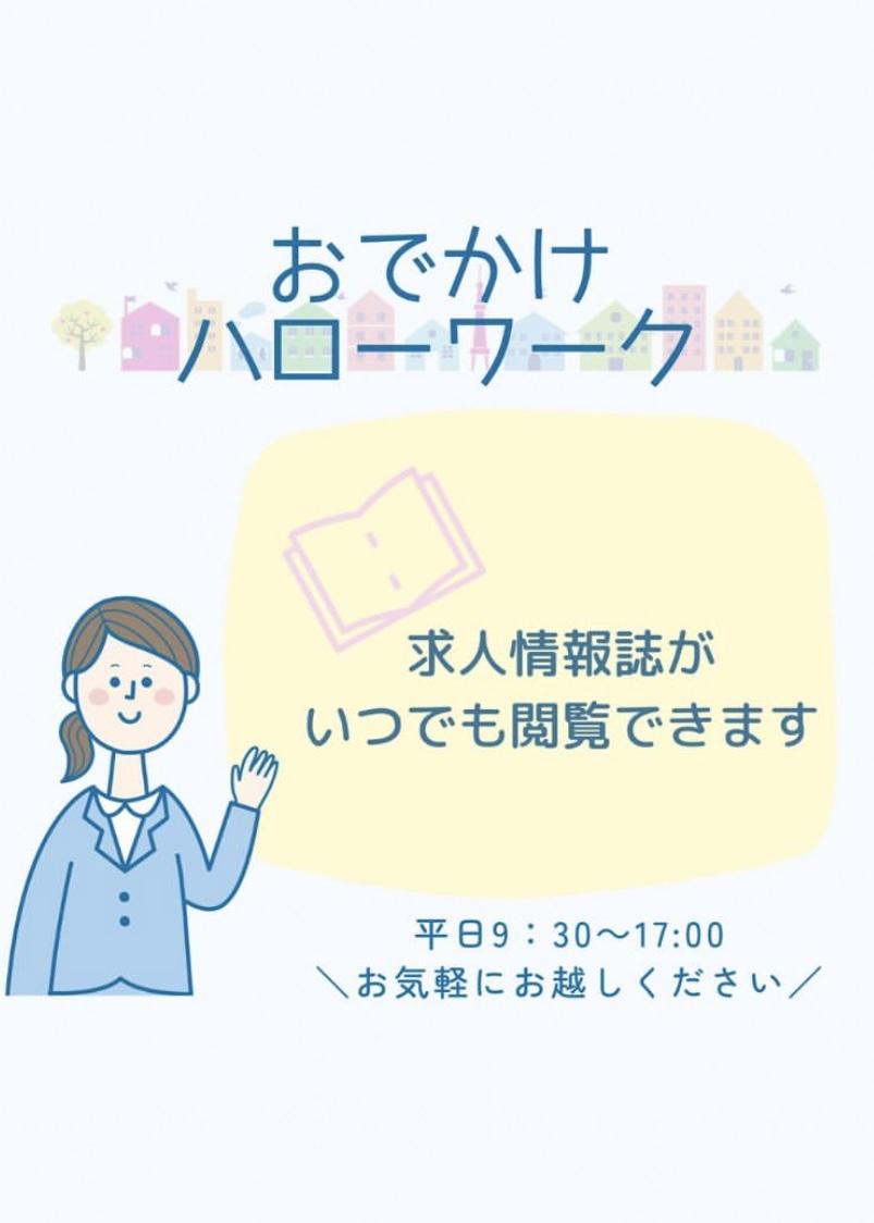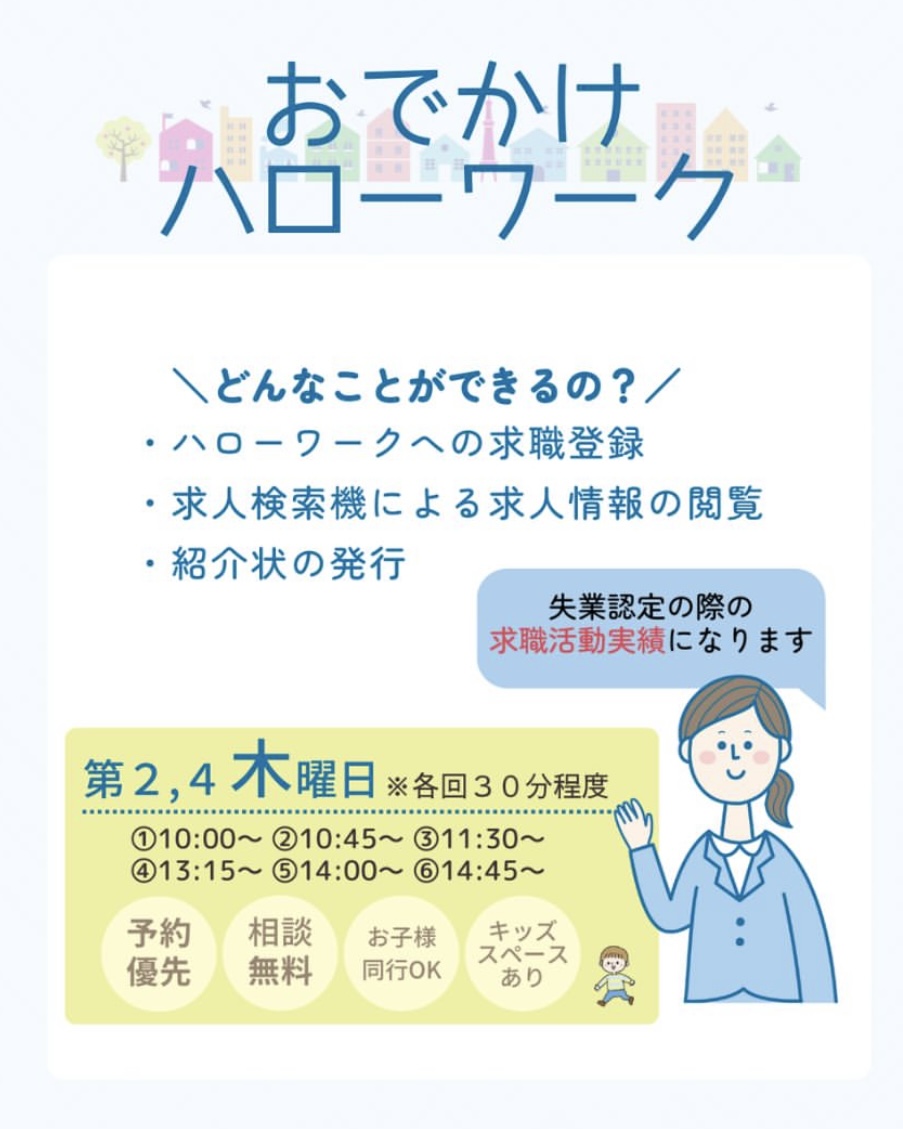 おでかけハローワークでは、ハローワークへの登録、求人閲覧、紹介状も可能です😊✨ もちろん職業相談もOKですので、お気軽にお問合せ下さい(^^) キッズスペースのある個室なのでお子さんと一緒にも大歓迎です✨ お問合せやご予約は、LOCOまでお気軽に~😊 【完全予約制】※各回30分程度 ご希望の時間をお知らせください(*^^*) ◎第2、4木曜日 ➀10:00~ ➁10:45~ ③11:30~ ④13:15~ ⑤14:00~ ⑥14:45~ 【ご予約】 ☏0749-53-4480 LINE @:@346hnxis -------------------------------------------------------- *マザーズジョブステーション
