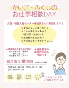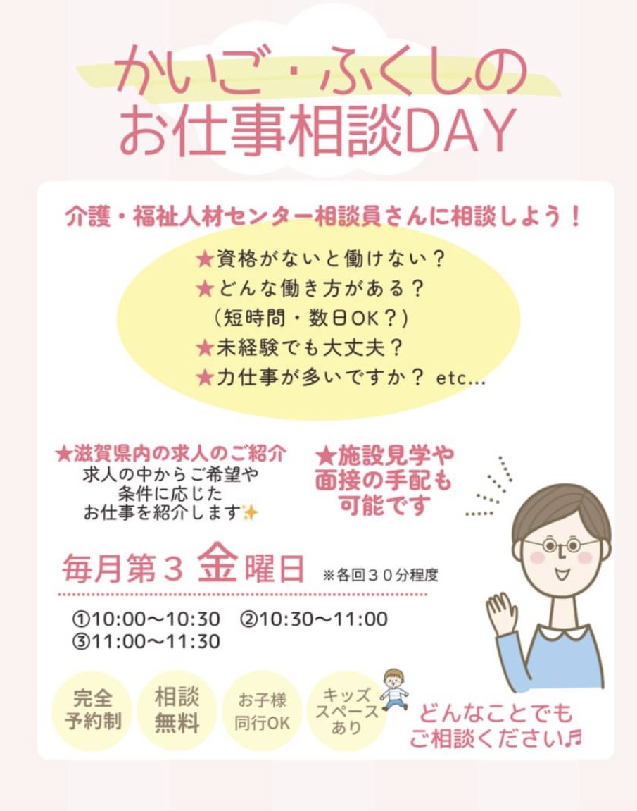 〈介護・福祉職場で働いてみたい…〉 〈転職 仕事復帰したい〉 〈子どもを連れて相談したい〉 など・・・ 介護・福祉に関心のある方あつまれ~🤗 例えばどんなことが相談できるかというと!?? ●資格がないと働けない? ●働きながら資格を取得できる? ●未経験でも大丈夫? ●どんな働き方があるの?(短時間・数日OK?) ●力仕事が多い? ●介護・福祉施設ってどんなところ? ●現場の雰囲気をしりたいなぁ など、あなたに合ったお仕事さがしをサポートします✨ 少しでも興味のある方は、ぜひお気軽にお越しください🌈 どんな些細な事でも相談にのってくださいますよ(*'▽')♪ キッズスペースもあるので もちろんお子さまの同行も可能です🎈 ☆完全予約制☆ ①10:00~10:30 ②10:30~11:00 ③11:00~11:30 ご希望のお時間をお知らせください(✿◡‿◡) 【ご予約】 ☏0749-53-4480 LINE @:@346hnxis -------------------------------------------------------- *保育のおしごと