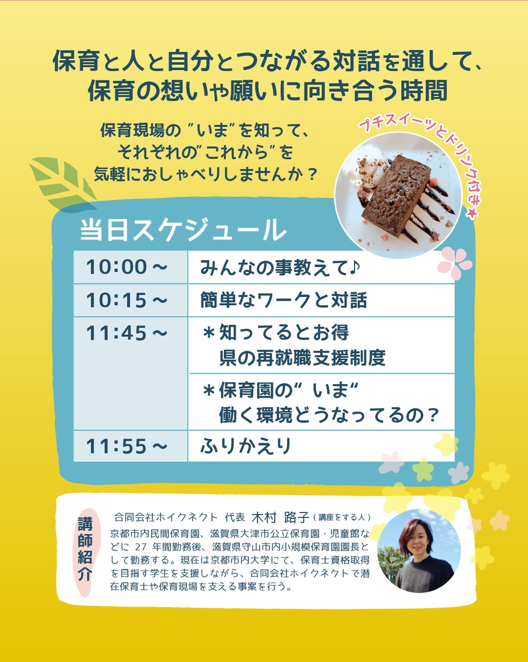 プチスイーツとドリンクを楽しみながら、対話やすこし簡単ワークを通じて、保育のお仕事について情報交換したり、少しだけ先の”これから“を想像してみたいと思います◡̈