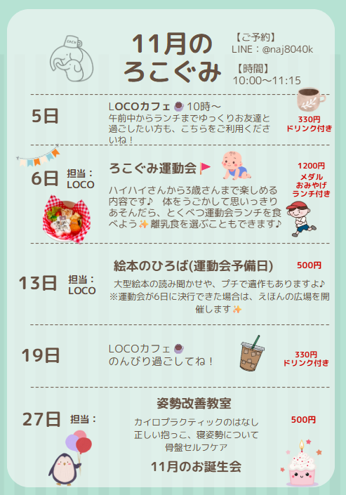 *時間 10:00-11:15まで ●ろこカフェ 【毎週水】 利用料330円ドリンク付き ●ろこ教室【毎週木曜日】 ※登録された方に上記スケジュールを送らせていただきます。 参加費や教室詳細をご確認ください