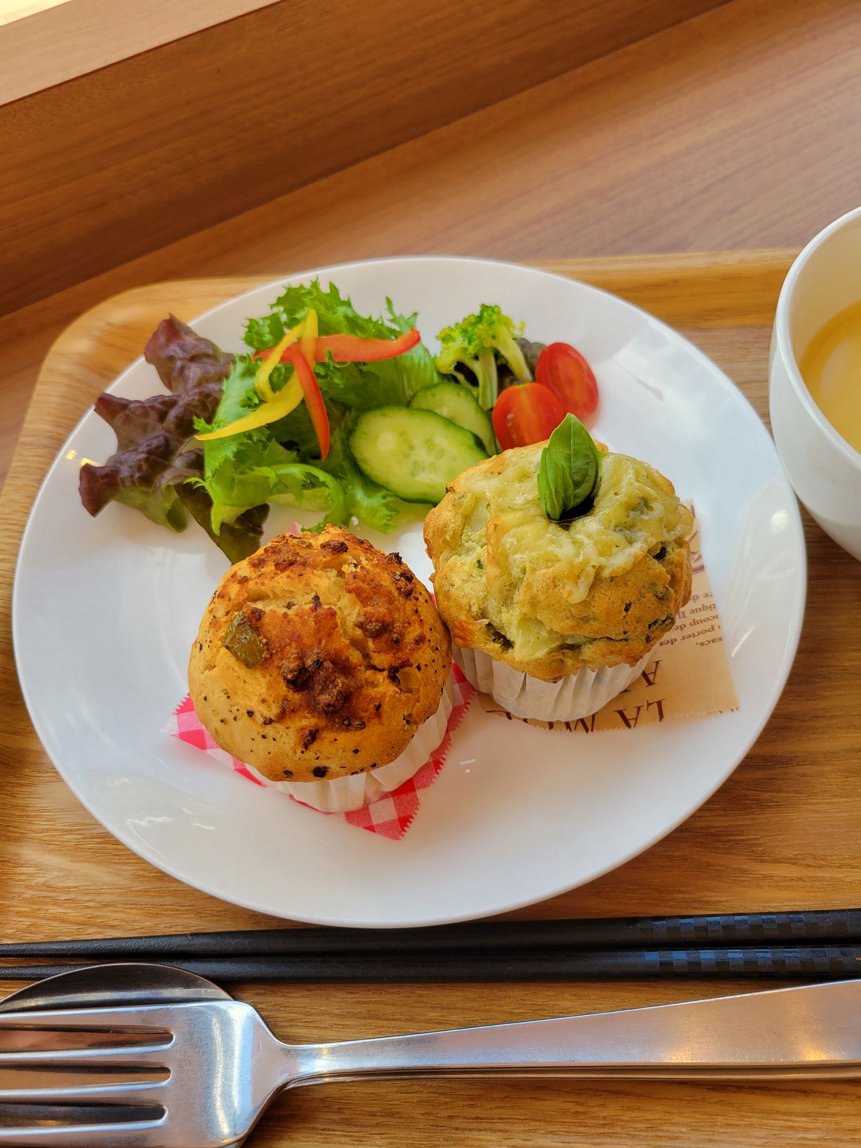 好調のオリジナルマフィンSETは、 ・バジルチーズポテト ・キーマカリー ・きのこチキングラタン 上記から2つのお味を提供します(*^^*) 週によって違いますのでスタッフに聞いてねー!→2月には、うどんMENEに変わりますのでお早めに食べに来てね♪